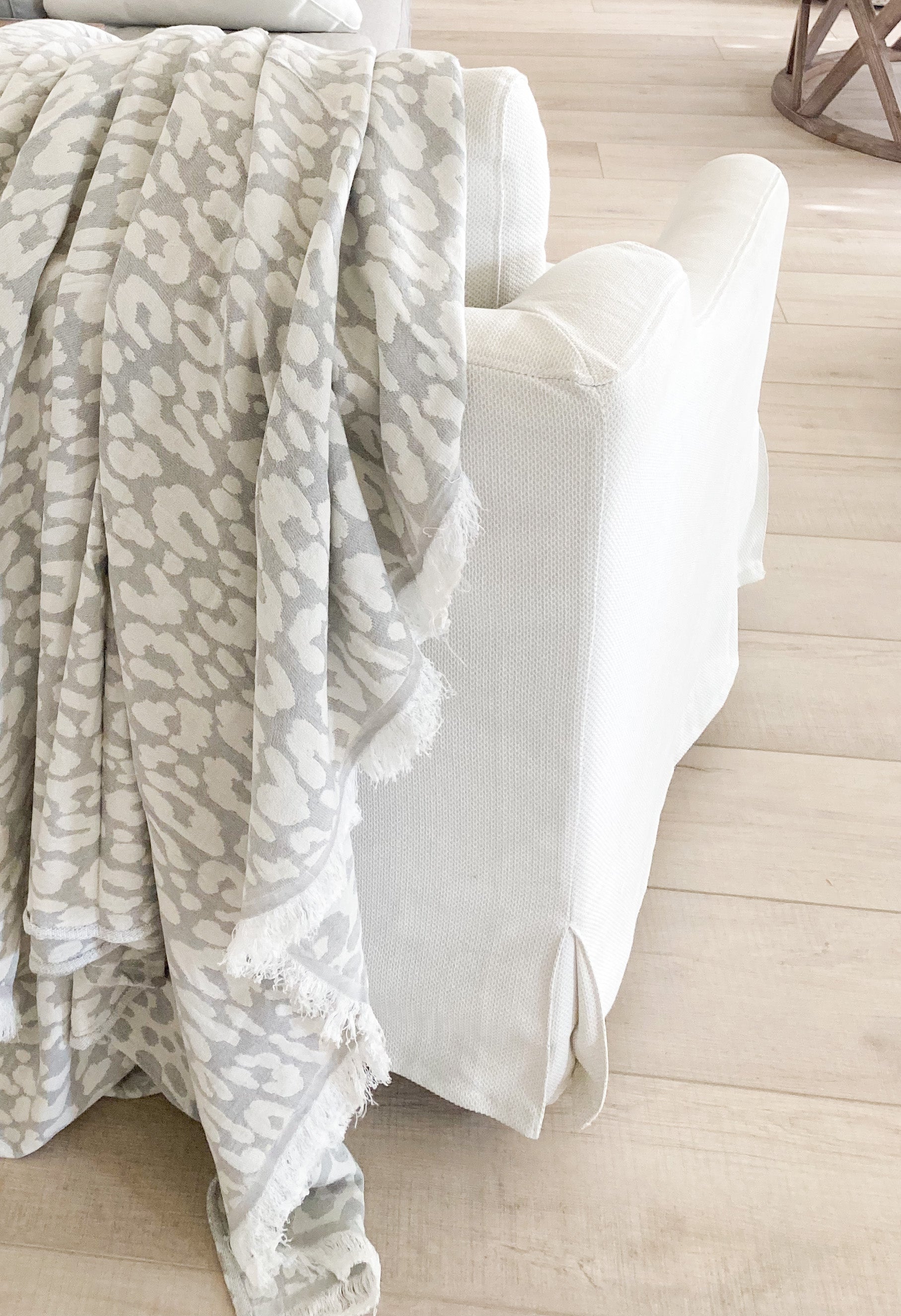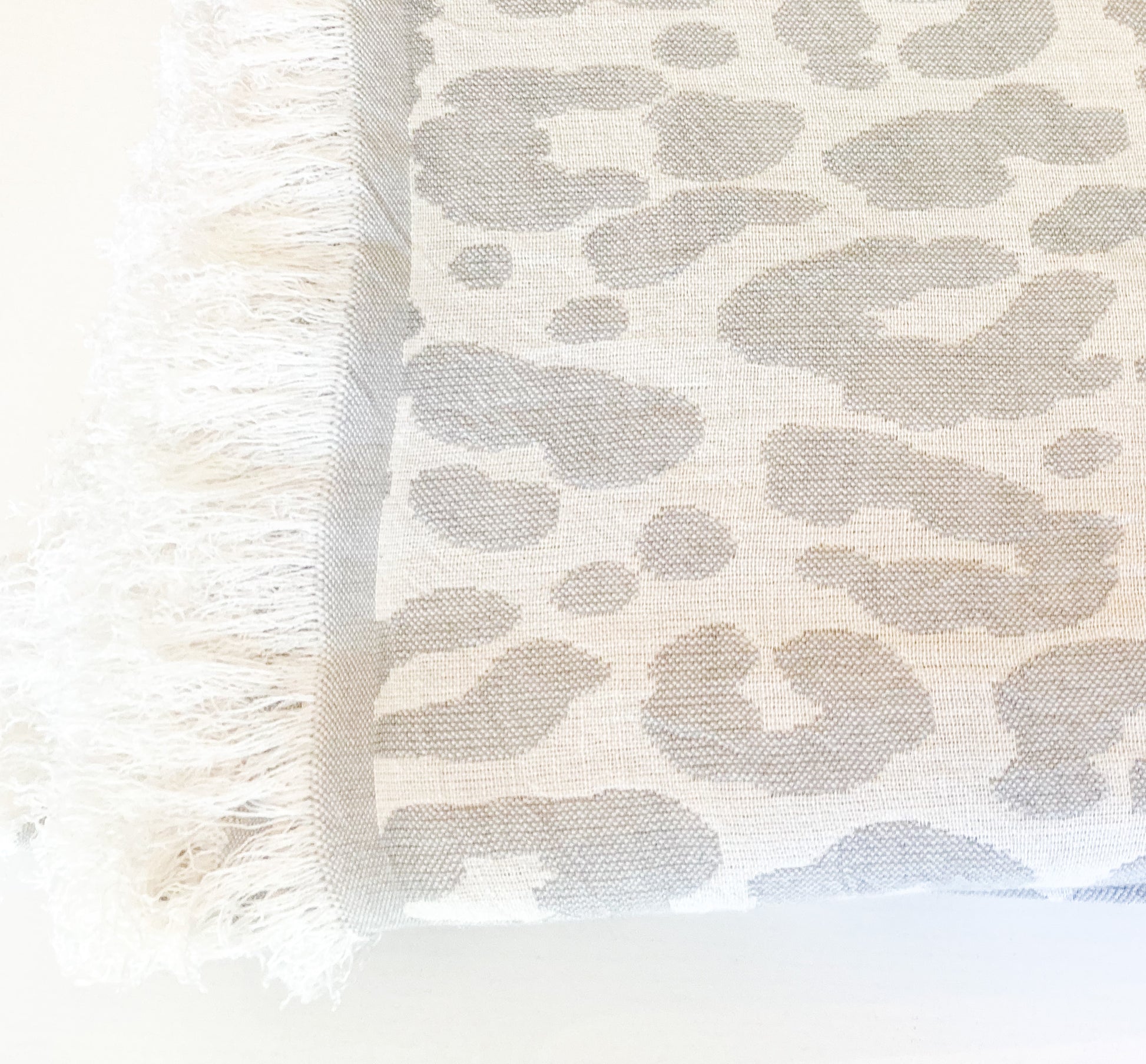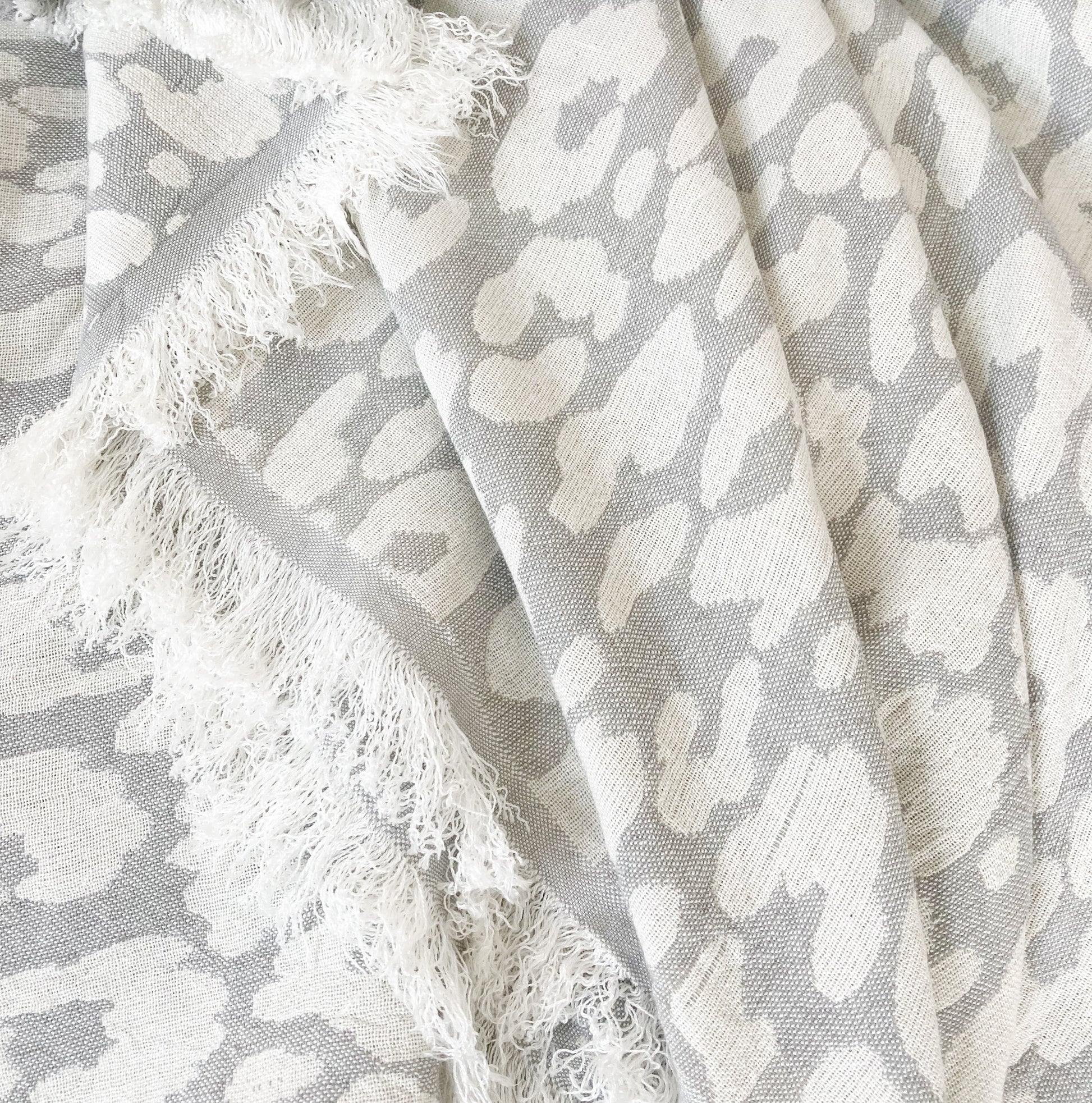 Add a bit of style to your cozy evening at home. Handwoven with a leopard print design and accented with soft fringe at the edges. Snuggle up in style this fall!
